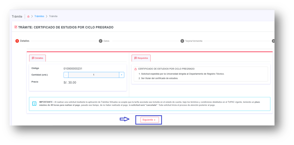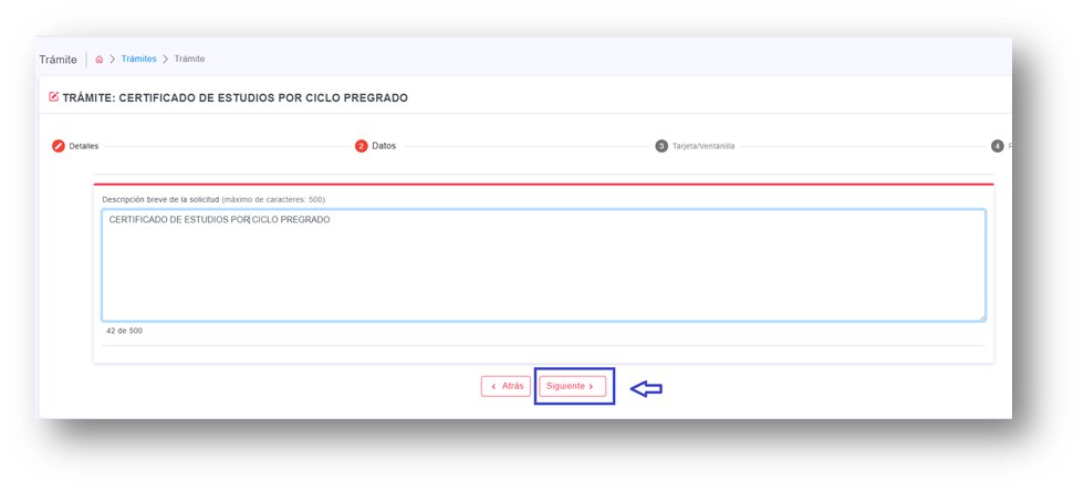 Luego de ello, primero, deberá ingresar una descripción breve acerca del trámite, luego, deberá agregar el documento requerido (formato PDF) y finalmente, dar clic en el botón"Siguiente"