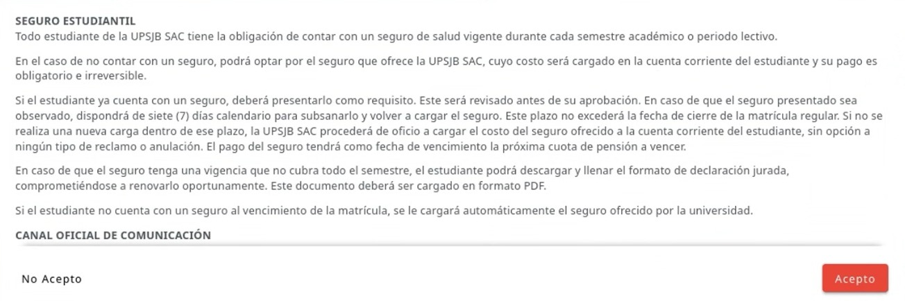 - Si no se realiza una nueva carga dentro de ese plazo, la universidad de oficio cargará automáticamente en la cuenta corriente del estudiante el monto de S/ 13.65 correspondiente al seguro ofrecido por la universidad para el semestre en vigencia.